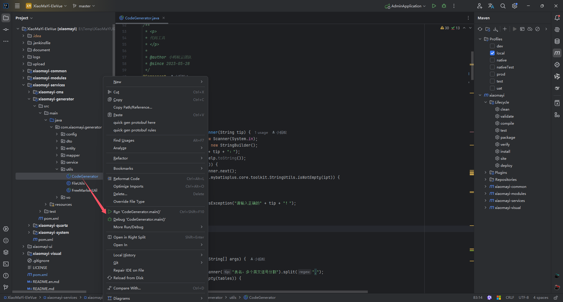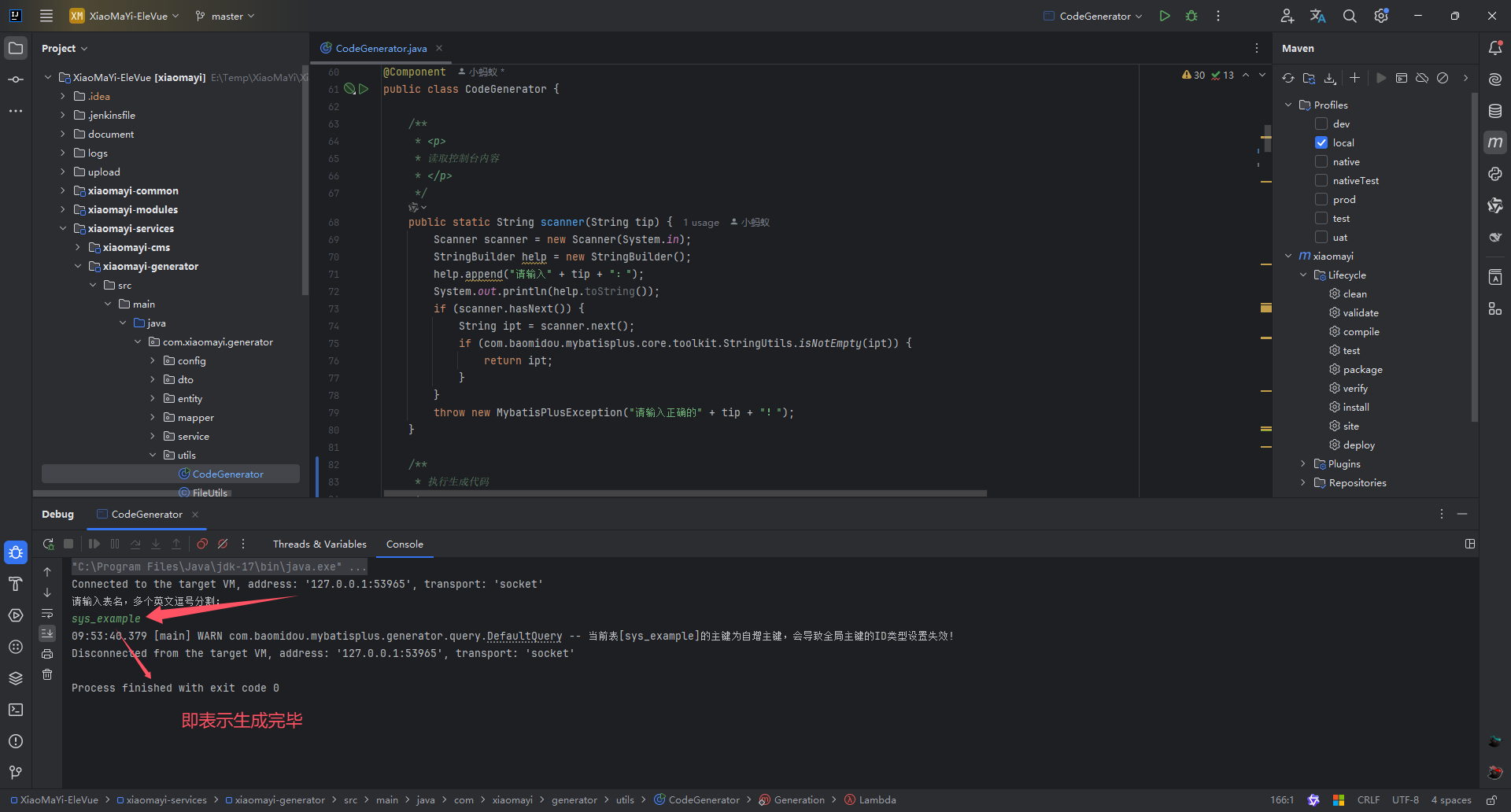 模块文件和代码默认是生成到 xiaomayi-services/xiaomayi-system 模块下,如需变更请修改 CodeGenerator 生成器工具库中的参数。